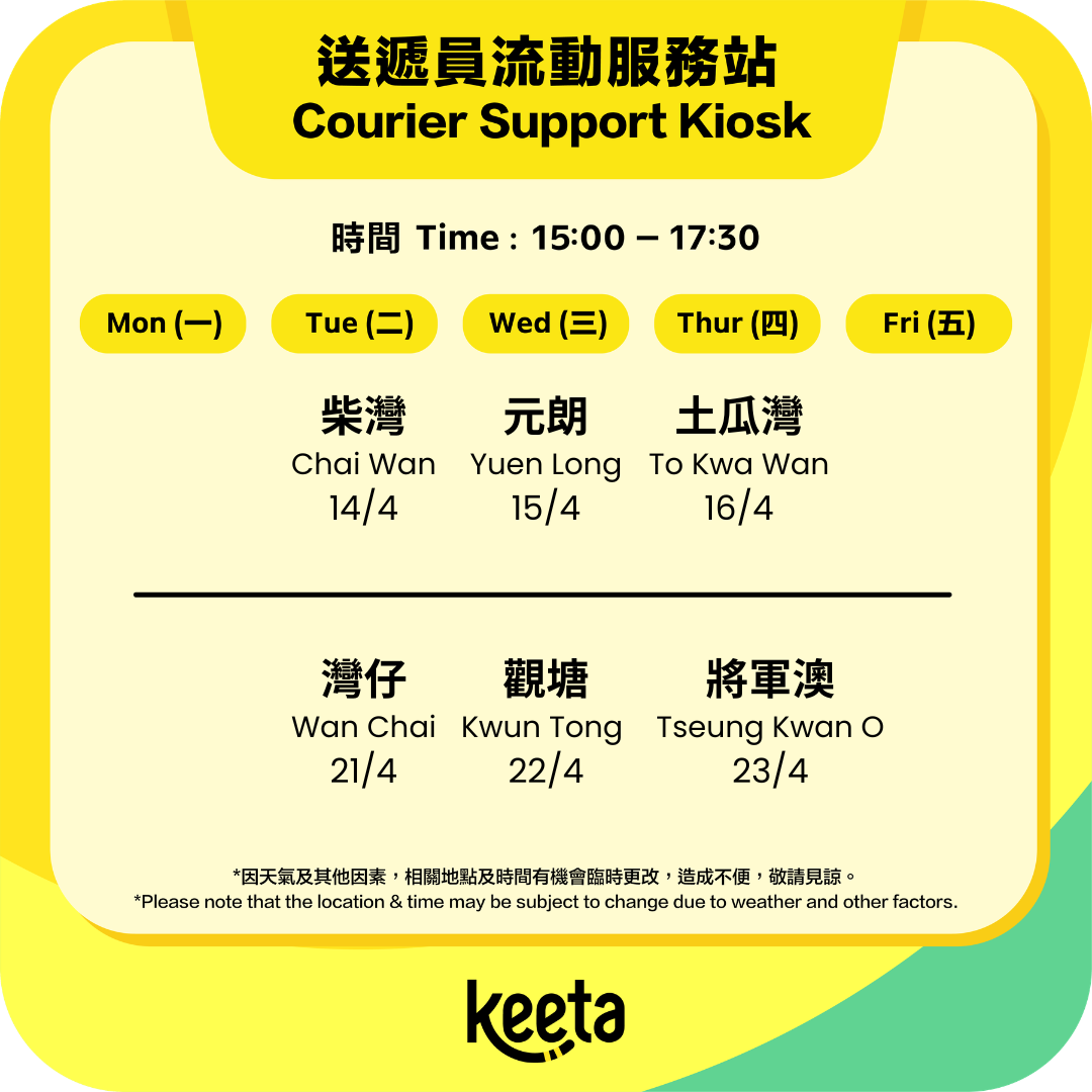 四月的Keeta流動服務站安排如下,如有任何疑問,歡迎到訪流動服務站進行查詢。